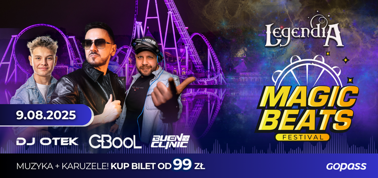 Magic Beats Festival to jedyne w Polsce wydarzenie, które łączy koncerty muzyczne z zabawą na karuzelach i rollercoasterach Legendii. Tego wieczoru Legendia wypełni się muzyką, światłami i niepowtarzalnymi emocjami.