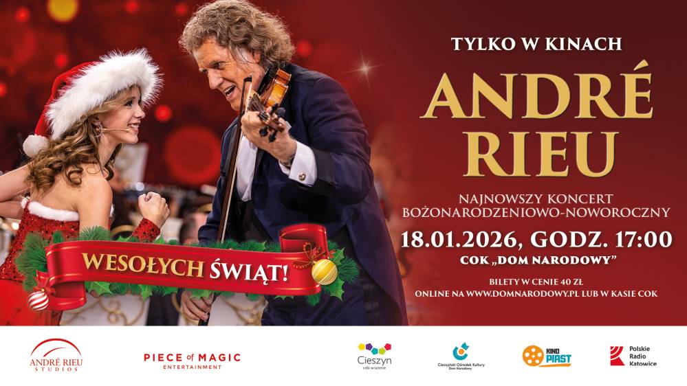 Cieszyński Ośrodek Kultury "Dom Narodowy" oraz Kino Piast zapraszają na olśniewające show Maestra André Rieu. Zapraszamy do Cieszyńskiego Ośrodka Kultury "Dom Narodowy" na retransmisję najnowszego koncertu bożonarodzeniowo-noworocznego z Maastricht pod tytułem „Wesołych Świąt!”. Projekcja koncertu odbędzie się w niedzielę 18 stycznia oraz ponownie, w niedzielę 1 lutego o godzinie 17:00.