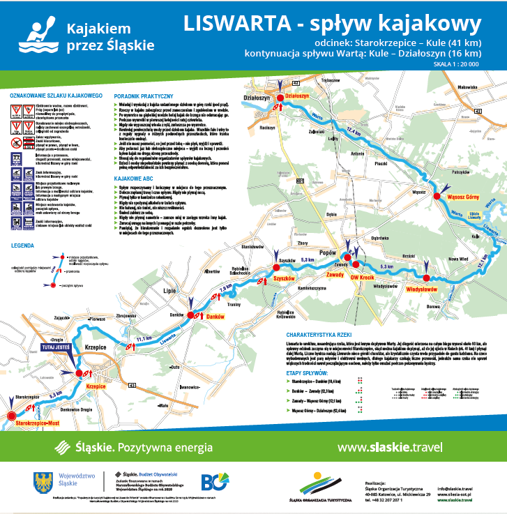 Informacji na temat znakowania szlaków kajakowych na Warcie i Liswarcie dostępne w biurze Śląskiej Organizacji Turystycznej w Katowicach. Osoba do kontaktu: Iwona Pakuła-Błoch, tel. 32 2072073, iwona@slaskie.travel.