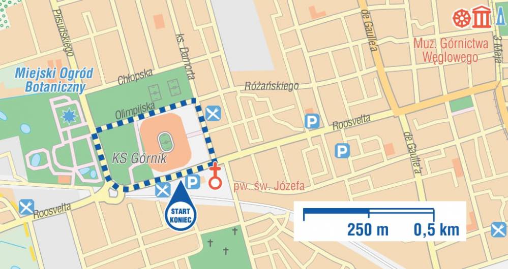 Idziemy dalej do końca ul. Olimpijskiej, gdzie skręcamy w lewo, w ul. Piłsudzkiego i po 150 m po prawej stronie napotykamy bramę wejściową do MIEJSKIEGO OGRODU BOTANICZNEGO. Czas zwiedzania ok. 1 h natomiast w budynku kaktusiarni i palmiarni szerokość ścieżek wewnętrznych jest niedostosowana dla osób przemieszczających się na wózkach. Wejście do ww. budynków jest dostępne dla wózkowiczów przez drzwi palmiarni z poziomu gruntu. Toalety niedostosowane dla osób poruszających się na wózkach inwalidzkich. Na terenie ogrodu rozmieszczone są drogowskazy oraz tablice edukacyjne. Z MOB idziemy do parkingu przy ul. Roosevelta.